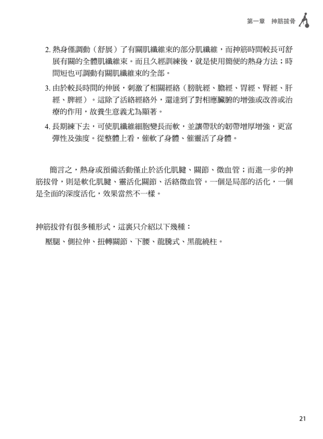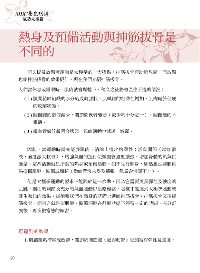 內容簡介 二十多年的追尋體悟,濃縮成簡單易學、功效奇大的「養生功法」! 溫碧謙醫師再度以西醫的科學觀點來解釋氣功太極、經絡穴位的原理,並配合太極拳師父—房知安,經驗傳承的親身指導,從熱身的舒展筋骨,到暢通氣血的轉丹田、精選八式氣功太極拳,透過有條理功法、招式,促進全身血液循環,加速代謝廢物的排出,不須太大的場地,也不須任何設備,隨時想到就可以做,達到即時即地養生的效果。五大主軸 .抻筋拔骨 透過壓腿、側拉伸、扭轉關節、下腰的方式,深度活化肌腱、靈活關節、活絡微血管,充分舒展! .氣功基本功 將顯少外傳的五種丹田運轉秘訣與太極拳運動結合,讓氣血流通達到最佳效果。 .氣功太極拳八式 挑選最精華的定步雲手、定步倒捲肱、揉球、揉棍、反雲手、螺旋手、十字手、開合手等8個招式,讓處於忙碌生活的你,每天只要花十分鐘就可以擁有健康好身體。 .收功式 氣功太極運用了丹田運轉使氣血運行,讓平常不會動到的內部臟腑充分運動,因此需要特有的五個收斂功式茲以調息。 .經絡穴位圖 針對舒筋活絡拍打法中所述的各個經絡穴位,以全彩插圖標明,可以輕鬆找到正確又有效的穴位。本書特色 ◎以簡易的氣功太極方式來舒展筋絡,進而達到健身、養生、抗老治百病的效果。 ◎從西醫觀點解說氣功太極的原理和效果,以西方的科學印證東方的氣功太極。 ◎由旅居邁阿密、經驗豐富的太極拳老師親自示範教學,公開不外傳的丹田運轉秘訣。 ◎濃縮最精華的八個招式,讓處於忙碌生活的你,每天只要花十分鐘就可以擁有健康好身體。 ◎簡易舒筋活絡拍打法,融合中醫經絡穴位,並附全彩圖解介紹。 ※特別加贈:養生功法教學DVD 作者介紹 作者簡介溫碧謙 畢業於高雄醫學大學醫學系,曾任林口長庚醫院內科醫師。而後赴美深造,成為美國愛荷華大學醫學院教授,1995~2001年獲選為全美放射腫瘤科專科醫師考試官及口試官,2001~2003年擔任全美放射腫瘤科專科住院醫師檢核筆試委員會主席。曾任職美國邁阿密大學醫學院教授,今任職南佛州甘迺迪醫學中心主治醫師。平時看病、教學、研究著述,暇時打坐、修習佛法及推展MBC養生功法。房知安 本名房承基,字知安,山東泰安人,現居美國邁阿密市。自幼家教習拳,同時學習醫理、針灸、經絡,文革期間迫於政治運動時斷時繼多年,1978年始重拾拳業,對楊氏太極拳習練的養生功效頗有心得,年近八十仍保持柔軟的筋骨及健康硬朗的體魄。任專業教師多年,先後於南開大學、天津師範大學、天津幹部療養院教授太極拳,亦曾在臺灣文化大學國術系短期授課。 名人/編輯推薦 美國佛州國際大學教授 吳光熙高雄醫學大學神經學科副教授 施邦英文化大學國術系主任 莊榮仁 序 推薦序I 說來好笑,與溫碧謙醫師在大學時期同班了7年(全班連同僑生近130人),當時因不同屬性而並未深交,25年之後因緣際會的在邁阿密重逢,經過幾次短暫的交談,瞭解老同學有一份悲天憫人的用心,與極為自我省思的人格。 其後數度再相逢,才知道彼此對於中華固有的太極之道與氣功皆有相同的興趣。更湊巧的是,我個人的專長正是動作障礙疾病及運動生理學,與溫醫師相聚時,我們會彼此討論、分享一些運動、動作學習的機轉,也因此而有機會參與溫醫師嘗試以西方醫學觀點對太極氣功運作,做出一個有別於傳統方式的思考與詮釋。 我期望這一本新書能夠給世界一種新的對於”氣功太極”的觀感,也希望眾多的華人練習者能有一本深入淺出的書可以參考,不用在因口耳相傳而失之,或陷入”以訛傳訛”接收到不正確資訊的困境。同時也期望溫醫師與房老師不斷切磋的再切磋,將來能有更精闢的剖析,讓更多的學習者得以有容易瞭解、更深入的練習,而持之以恆的達成健身的目的,預防疾病上身。如此開啟一扇通往傳統武術之窗,讓大家期待未來會有更多的秘密被破解,並流傳未來千古,成此一書豈不是人間一大樂事! 本身會對氣功太極發生興趣的另外一個原因是因為內人,內人接受朋友的建議曾學了一段時間的太極拳。但當時因為要送孩子上學,每次她換了裝到練習場時,同學們的拉筋伸展動作都已經完成,準備開始起式,她也未再能補強前式就跟著比劃起來,加上老師也沒有指導說明,學了一年多毫無進展可言,身子還越練越弱,。之後才想到說,任何運動都得要暖身,才不致於有運動傷害,像內人這樣的方式,又無良師指導,豈不因差之毫釐,失之千里? 又我中華文化博大精深,諸子百家各立其道莫衷於是,大家是否得任憑機運,隨學隨安?現在連廚師都得認證,日前聽餐廳的大廚說,連海峽對岸的楊州炒飯也有了國家標準認證,否則不可任意稱呼自己的炒飯為”楊州炒飯”,那切身的武術練習豈能毫無標準可循,此為對本書極為期待之另一個理由。 現在雖與溫醫師相隔地球兩端,仍經常保持連絡,目前未能接觸房老師之武藝極為抱憾,希望以後能有機會親見老師的演練,也希望將來會有更多精彩的書籍不斷的呈現給大眾!高雄醫學大學神經學科副教授施邦英推薦序II 認識房承基老師的機緣非常特別,起因於2010年6月溫碧謙醫師透過本校體育系彭淑美老師,推薦了房老師到系上演講,關於太極拳以及其學習的經驗。在演講中房老師講解了許多太極拳修練上比較隱誨不為人知的功法,同時和一般的太極拳練習法也有所不同,引起不少同學們的興