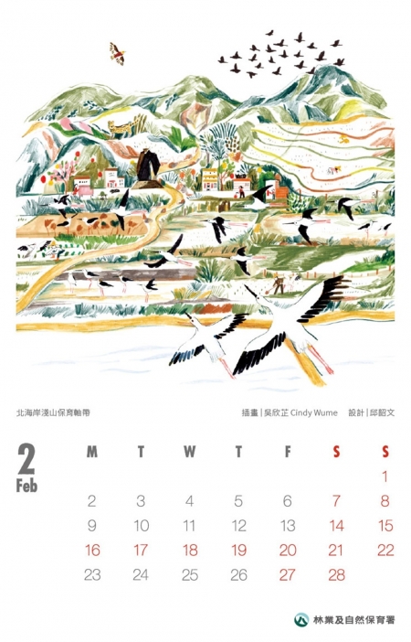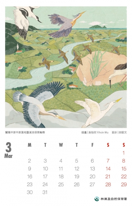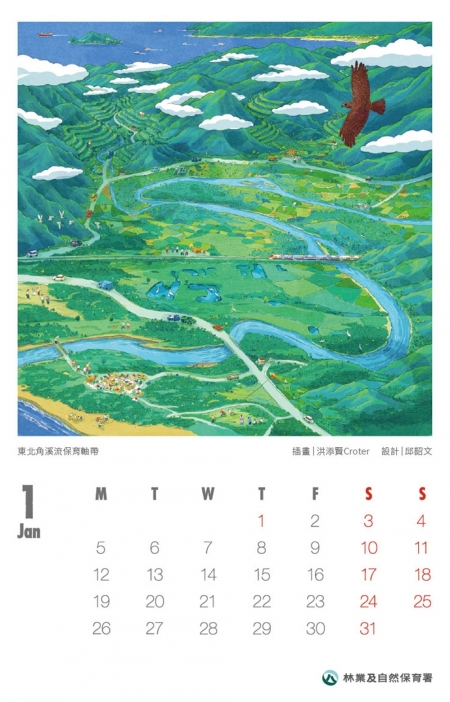 想像自己擁有鳥兒般的翅膀,飛越臺灣碧綠的山林與豐饒的田野。2026年,林業及自然保育署推出全新主題月曆,以《阡陌之森》為核心,呈現臺灣壯闊的「大尺度地景」。月曆以生動細膩的畫面,展現森林、溪流、農田、聚落、埤塘、魚塭、沼澤與湧泉等多樣的棲地類型,帶領讀者一同探索臺灣豐富的自然地貌。同時,藉由突顯特色的動植物資源及相關的棲地保育議題,特別突顯臺灣特色的動植物資源,並關注棲地保育的議題。透過多角度的視覺呈現透過不同觀看角度,從空中鳥瞰、溪流中仰視、海平面眺望等視角,一場跨越空間的觀景之旅即將展開,引領大家一同俯瞰台灣的多元生態。