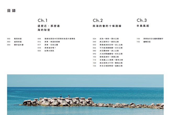 屏東海洋專書《在屏東與海約會的十種方式》,編輯團隊以採訪、調研轉譯、融合外界觀點,搭配寫實攝影與插畫,為屏東海洋的多變與迷人,設計十條遇見海洋的路線:「潛水之路」、「信仰之路」、「浪人之路」、「水行之路」、「漁人之路」、「共生之路」、「港濱之路」、「單車之路」、「養殖之路」、「遊艇之路」,以海上、水下、沿岸視角,讓人從中發現與海靠近的不同方式。