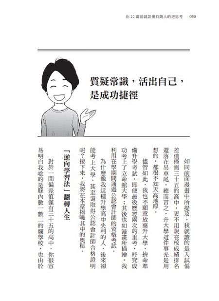 就在他人生不知何去何從時,領悟「搞錯方向,再怎麼努力也不會成功」,於是改用不同於一般人的讀書方法,終能考上京都第一學府立命館大學,甚至在大學時就考取會計師執照,成為日本最年輕會計師之一。