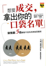 問題就是機會所在,征服機會就等於賺取錢財。而且第二筆錢永遠要來得比第一筆錢容易到手。《紐約時報》、《華爾街日報》、亞馬遜網路書店、邦諾書局最佳銷售榜第一名。《紐約時報》暢銷書作家葛蘭特‧卡爾登(Grant Cardone)告訴你超越不景氣的祕密。「80%的利潤,來自於20%的既有顧客。」可說是亙古不變的道理。尤其是處在這種景氣混沌不明的環境下,你只有兩種選擇:第一,身為它的一部分,然後在幾十億人口搶食完大餅後,再撿大家吃剩的;第二,打造出屬於你自己的經濟,不再成為大環境的犧牲品。多數的銷售書籍都在教你怎麼提升銷售、增加利潤,這本書也不例外,但他最與眾不同的點,在於如何創造與顧客的第二次、第三次的利潤,甚至藉由既有顧客去衍伸新的顧客。作者指出,大多數的業務員在首次銷售花費的心力最多、也最為熱情,但是一旦將潛在顧客成為主顧客後,反而不懂得把握讓顧客再次上門的機會,原因不是不願意去牢握,而是不得其門而入。書中對掌握顧客的方式不勝枚舉,有趣的是,許多閱讀此書的業務員相偕表示,「跟著作者的步伐,你會停不下來,與既有客戶感情愈來愈好,而且從老客戶開創出的新客戶,準確性更高。」從現在開始,就讓你的競爭對手繼續為大環境自艾自憐,而你就跳脫出來,拿起這本書攻城掠地吧