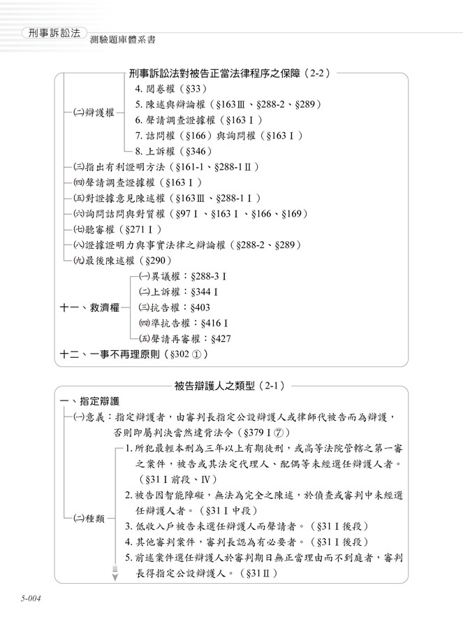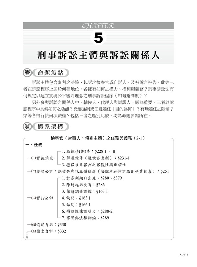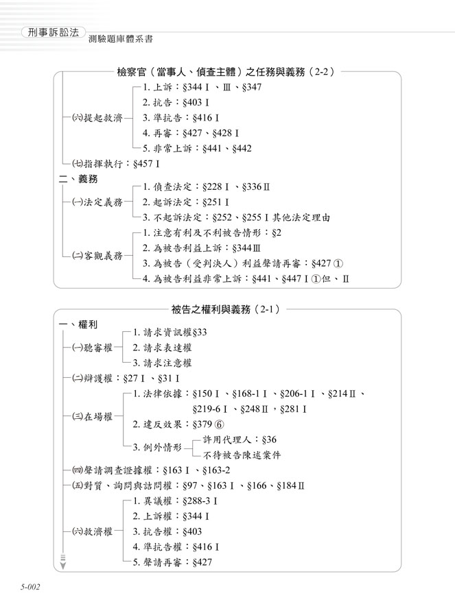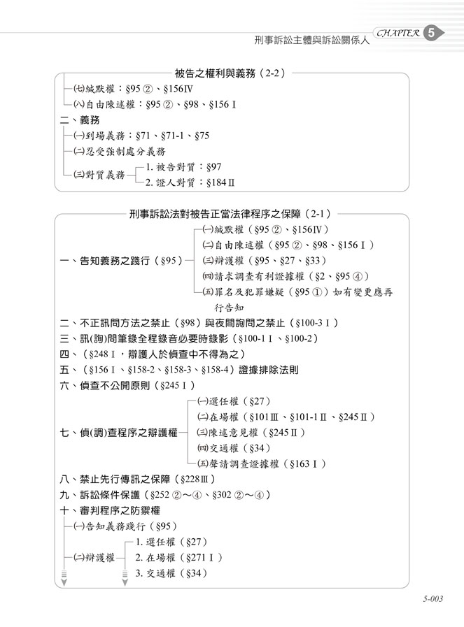 Chap1、刑事訴訟之意義Chap2、刑事訴訟之基本原則Chap3、刑事之訴訟之結構Chap4、刑事訴訟之效力Chap5、刑事訴訟主體與訴訟關係人Chap6、訴訟客體Chap7、訴訟條件Chap8、訴訟文書與期日期間Chap9、偵查與公訴Chap10、檢察官處分Chap11、自訴Chap12、審理Chap13、裁判Chap14、強制處分Chap15、證據Chap16、通常救濟程序Chap17、非常救濟程序Chap18、執行Chap19、附帶民事訴訟Chap20、歷屆試題