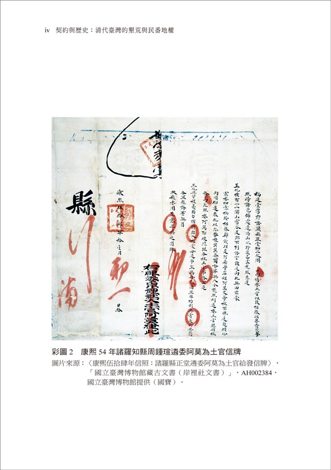 這本書選錄1991年筆者進臺大碩士班以來近30年間發表的8篇論文(參見附錄二),主題均環繞在清代臺灣的農墾、地權和契約。最晚發表的一篇是第八章〈從番屯到隘墾〉,其實也是最早寫成的。這篇文章原本是1996年完成的碩士論文〈日治時期臺灣林野整理事業之研究:以桃園大溪地區為中心〉中的一章,當時因指導教授吳密察的推薦而得以獲邀在淡江大學歷史系主辦的「臺灣開發史學術研討會」上發表,並收入會後出版的論文集中。但當我著手要將相關論文改寫成專書,重讀這篇早年的文章時,唯一還算好的就只有字裡行間散發著的年輕熱情,至於其史料解讀、章節架構、論證分析等,雖還不至於不忍卒睹,卻難免臉紅心悸。相信很多人都有類似的經驗,原本只想動手微調,最後變成徹底打掉重建,完全是一篇新的文章。整本專書的修改過程心情類皆如此複雜,既是困窘卻又感覺良好,最重要的不是自己在學術能力上的精進成長,而是清楚感受到了30年來臺灣史研究的深化、累積和擴展。因此,呈現在讀者眼前的這本專書雖可說是「舊作」,卻都做了一定程度的修改調整,目的是希望這不會只是本論文集,而是有著內在架構、有機連結,可以反映學術累積並展望未來的專書。