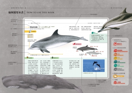 我們有幸為海保署編撰該署第一本的圖鑑,自然希望譲本書和傳統以分類形態描述為主的圖鑑有所不同。因此在海保署長官們的殷切期盼下,決定採用編撰百科繪本的型式,不計成本地大幅增加了精彩的圖片,特別是不容易拍到標本照的鯨豚丶海龜及軟骨魚類。感謝國內幾位知名的生態畫家及水底攝影師,包括柯鴻圖的鯨豚丶鄭義郎的鯊魟丶海龜,鄭杏倩小姐及林家蔚先生的插畫,以及許多朋友熱心提供他們拍攝的精彩生態照或標本照等,在他們的情義相挺下,讓這本書得以有不同的面貌呈現給國人。在這裡也要感謝海保署的付託和信任,讓我們這些來自學界和民間團體的夥伴們可以共同合作來編輯這一本圖鑑。黑潮文教的余欣怡和科博館的姚秋如兩位負責鯨豚丶中華民國野鳥學會的呂翊維負責海鳥丶島人海洋文化工作室的蘇淮負責海龜;海大的莊守正和游紀汝負責軟骨魚類,中研院的黃世彬博士和邵廣昭則分別負責友善釣魚類和其他硬骨魚類兩部分。在內容的撰寫上,我們也盡量用淺顯易懂丶可讀性高的文字,並加強每個物種的資源狀態及保育等級。把生硬的分類形態特徵,改成在圖片上直接標示該物種可資鑑別的主要特徵。只有魚類部分,因為種類多,在生態或生物學方面的研究資訊甚少,難以如願。這也說明了海洋生物為何在評估其瀕危狀態時,幾乎都是無危(LC) 或資料缺乏(DD) 等級的原因。當然,一本好的圖鑑除了需要圖文並茂之外,美編的功力更是重要。我們特別邀請莊小貴圖像設計工作室來擔綱,是因為他們在2014 年負責美編出版的《臺灣常見經濟性水產動植物圖鑑》一書,頗受好評的緣故。