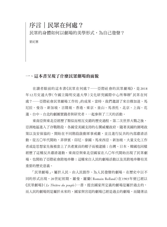 在讀者眼前的這本書《民眾在何處?——亞際社會的民眾劇場》,是2018年12月交通大學(今國立陽明交通大學)文化研究國際中心所舉辦「民眾在何處?─亞際社會民眾劇場工作坊」的成果。當時,我們邀請了來自雅加達、馬尼拉、曼谷、新加坡、吉隆坡、香港、東京、釜山、馬普托、北京、上海、花蓮、台中、台北的劇團實踐者與研究者,一起參與了三天的活動。