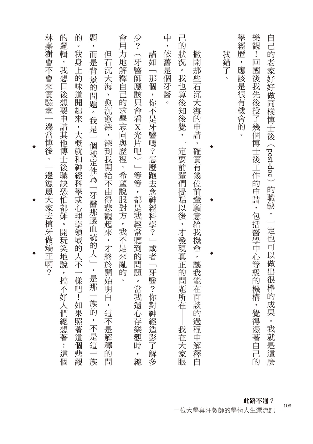 《此路不通?一位大學臭汗教師的學術人生漂流記》是關於一位年輕科學研究者的流浪故事:他如何在「牙科」與「神經科學」這兩個幾乎互不相關的研究領域裡不斷輾轉探索,並試圖把這樣的冒險傳達給後代學生。