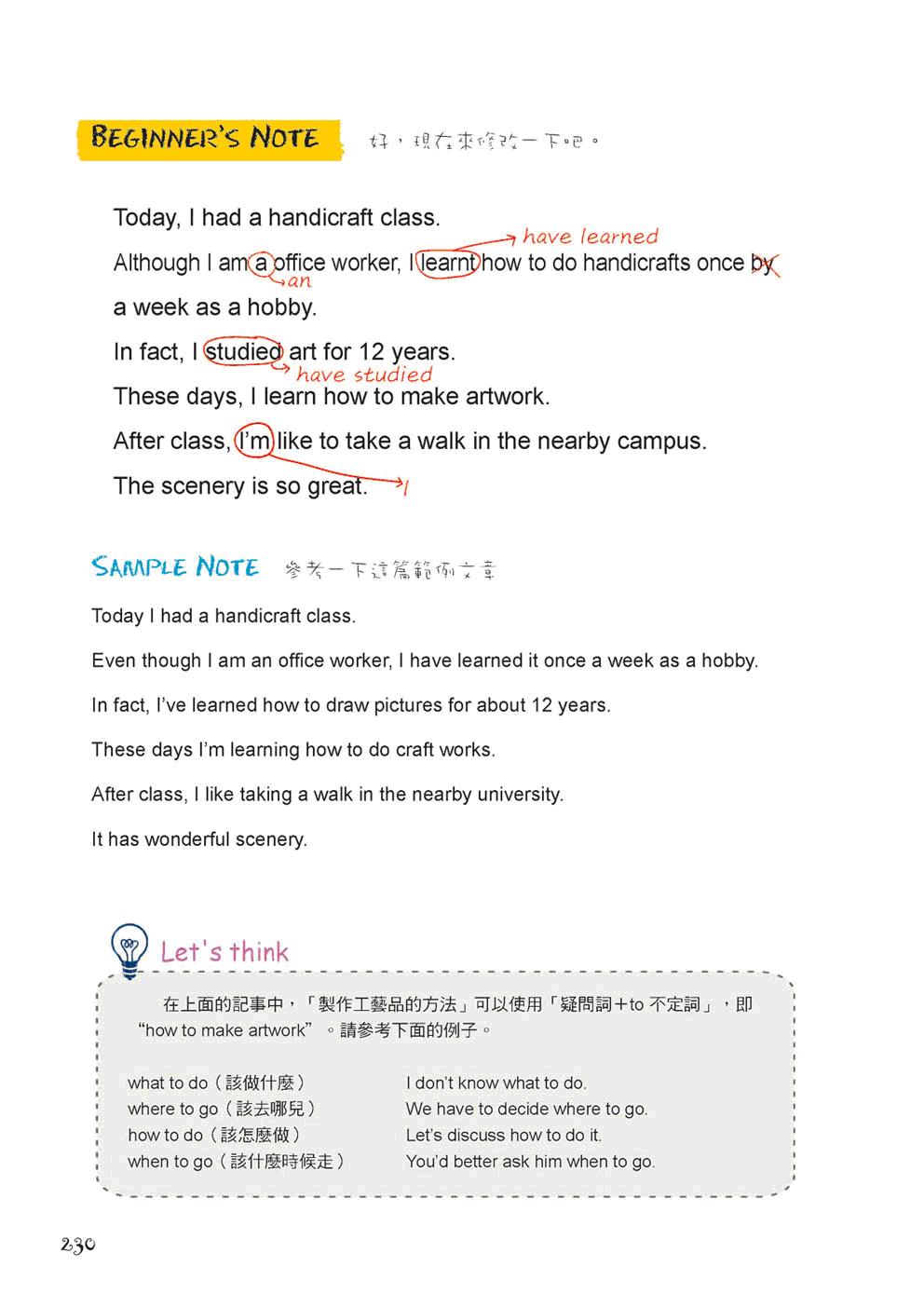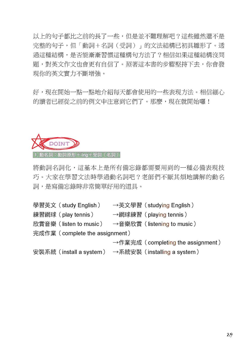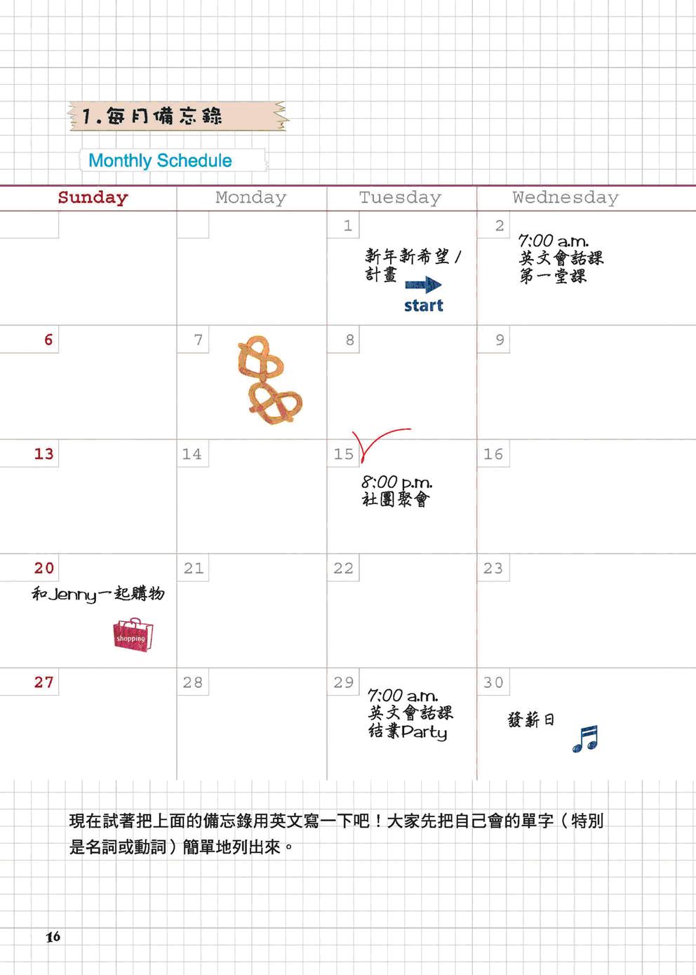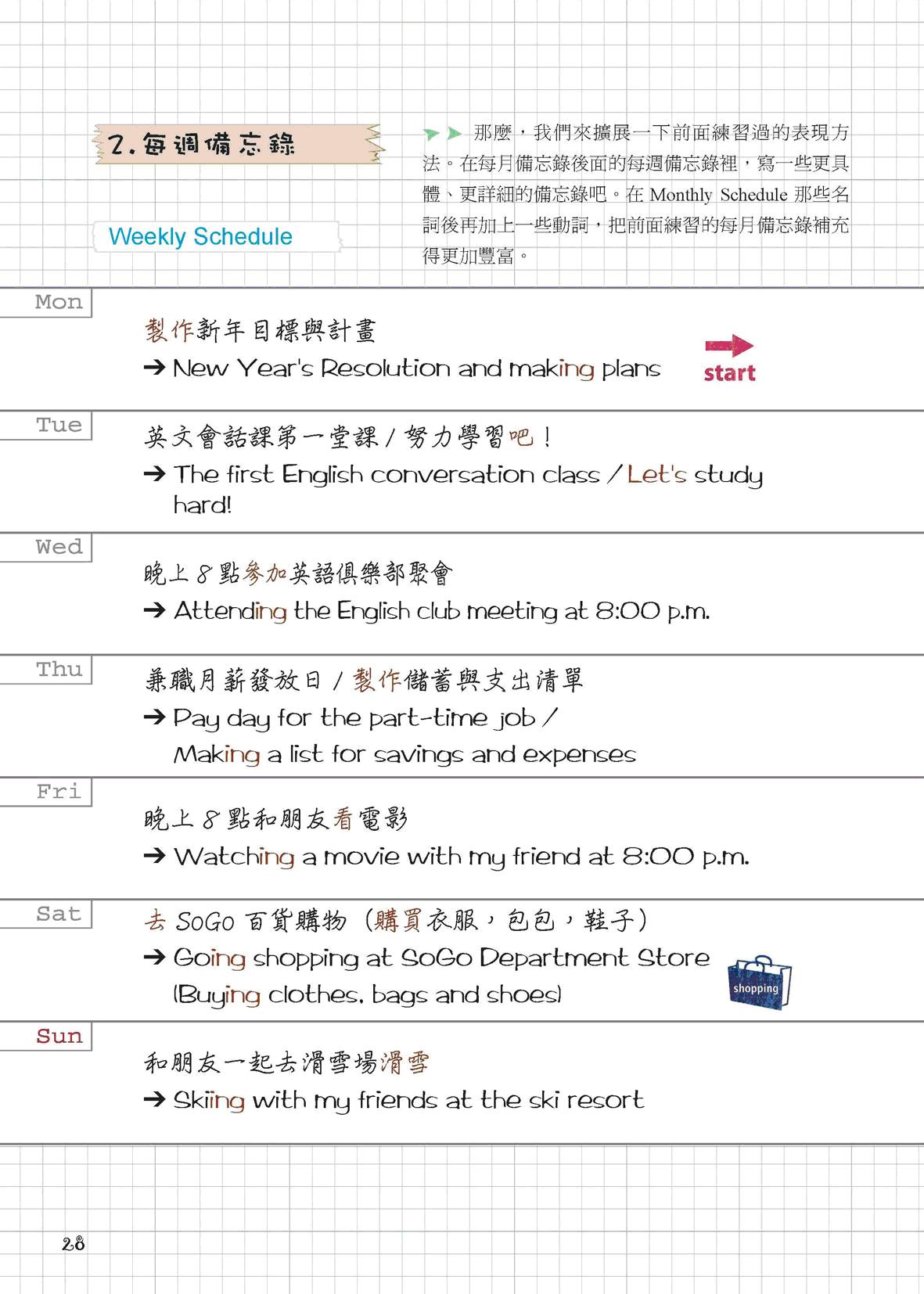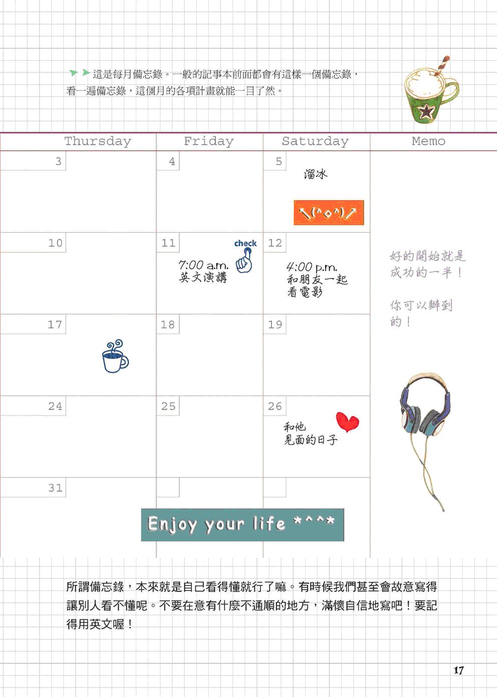 《每天需要的一句話》修訂版 從幾個單字→湊成簡單短句→衍生出多句→擴展成文章 隨時都在用的行事曆,就是最好的英文練習本 每天都用單字短句來記事,英文寫作變簡單! 「只是寫幾個英文句子,就要反覆地查字典、找句型、檢查文法?」 千萬別急著猛背文法、死記單字! 英文單字量再少的人,都具備「寫出好英文」的能力 讓英文筆記王告訴你「英文寫作變簡單」的祕密 學習無壓力,成效每天看得見! 要練習英文寫作,從哪裡開始著手好呢?答案就是現代人的必備工具:行事曆!市面上有各式各樣的多功能行事曆,許多大人物的成功祕訣,就是靠一本能夠隨手記下任何瑣事、同時也能用來激勵自己的「記事本」。學好英文也不例外,必須有效地利用時間,一分一秒都不能浪費。為了達到這個目標,最好的方法就是在你個人的行事曆裡,每天寫一點英文! 英文筆記王保證讓你用記事本學好英文的超簡單四大步驟: 【步驟1】 每天在記事本裡寫一點英文,用最簡單的單字也可以,自己看得懂就行了。 Ex.「和朋友去shopping」 →寫下英文單字,就是好的開始。 【步驟2】 請堅持下去繼續練習,即使每天只寫一行,甚至寫錯了也沒關係。 Ex.「4:00pm movie with my friend」 →沒有完整結構的句子也很棒! 【步驟3】 依照本書的教學,慢慢試著把英文句子加長,像是加上動詞與更多名詞。 Ex.「Buying clothes, bags and shoes.」 →開始學著使用動詞與更多名詞。 【步驟4】 不要記死板無聊的文法!用最簡單的「主詞+動詞」來做練習,就可以輕鬆寫出更多句子。 Ex.「I got up at 7 in the morning.」 →「主詞+動詞+受詞」,一個結構完整無錯誤的英文句! 不要怕寫錯會丟臉,反正沒有人會看見,重點是養成用英文單字隨手記事的習慣。 本書以「日記引導式」的方法帶領讀者練習英文寫作,循序漸進提供了各種心情與事件的相關詞彙,讓讀者邊寫邊吸收,從已知的字彙量開始練習,慢慢地懂得運用「關鍵句」及「活用句型」,將單字組合成一個完整的句子。從單字到句子,從一句到五句;最後以一篇日記範例與替換練習完整呈現,讓讀者可以模仿寫作。 照著本書學習,越寫就越知道自己哪些地方還需要加強,漸漸地,你就能寫出完整的一句話、完整的一篇短文,英文單字量再少的人也有這個能力!快翻翻你的記事本,哪些可以用英文來寫?本書教你用現有程度讓英文重生的方法,不趕快學起來不行!本書特色 每天都在用的行事曆,就是最好的英文練習本! 懂一點點單字文法就OK! 從單字、一句話、五句話到短文 學習無壓力,成效每天都看得見! 【特色1】每天的生活瑣事,就是寫英文最好的素材! 每次一看到英文作文題目總是想不到東西可以寫,但是寫部落格、facebook、噗浪卻可以連發好幾篇?寫英文,不要急著套公式、背句型,請從「最平凡」的日常生活瑣事出發吧!例如:記錄飲食內容的減肥日記、記錄課程內容的校園生活筆記、記錄每日工作進度的職場生活…等等。本書收錄生活中最常用的單字與慣用語,讓你寫英文記事,就像在facebook上面塗鴉一樣輕鬆。 【特色2】用英文寫下每月、每週、每日行程,偷偷訓練你的英語思考力 既然每天都會打開行事曆、每天都會排行程,本書教你如何把你腦內的「中文系統」轉換為「英文系統」。即使只會用最基本的、最簡單的字彙也沒關係,反正是寫給自己看的,想到什麼就可以寫什麼,中英夾雜又怎樣?在自己的記事本裡練習英文,不怕被人看笑話。 【特色3】丟掉難懂又學不起來的文法!用最基本的句型決勝負 你有沒有發現,有些文法好像學了很多次,但是卻一直「不太敢用」?英文寫來寫去,還是基本的句型最好用、寫起來最有自信!基礎句型「主詞+動詞+受詞」就已經超好用,記住它,就可以用英文表達出非常多的內容。比起貪多嚼不爛,不如熟練地好好使用這個最基本的句型,讓自己在說話與寫作方面都能更得心應手。 【特色4】用累積與串聯,把零碎的單字與句子發展成一篇完整的文章 「參加朋友的birthday party」、「和朋友一起去shopping」、「期末報告deadline」…你是否曾在行事曆裡寫下這樣的文字?這些曾經在你腦海出現過的單字,只要把它們一個個抓出來、重新組合並加以擴展,就可以發展出好幾個句子。透過本書「一天一句話」的備忘錄練習,把單字擴展成短句,把短句發展為長句,最後依主題把所有句子結合成一篇短文,跟著本書一起練習,寫出來的英文就會愈來愈豐富完整。 【特色5】專人為你修改文章的紙上英文課,天天開課! 別擔心你隨手寫的句子錯誤連篇,書中的「一句話備忘錄」單元裡會從句子中解析基礎文法,並加強補充英文寫作中最好用的介系詞。最後一個單元提供多篇範文,除了讓讀者可以模仿寫作,更仔細為你修改整篇文章,挑出以中文為母語者最容易犯的小錯誤。 【特色6】搭配華麗浪漫的精美插圖,每一頁都讓人直呼「超可愛」 是否很喜歡日本與韓國手繪風的可愛手帳呢?本書插圖由韓國知名插畫家精心繪製,不僅是一本英文學習書,同時也是一本漂亮的行事曆。在新的一年即將來臨前,擁有這一本全新的行事曆,用英文記下多采多姿的生活,讓身邊的同學朋友看到你「寫滿英文的可愛記事本」都羨慕不已。
