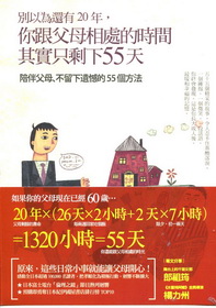 你該知道也該做的55件事 製造美好回憶的55種方式2011年根據行政院主計處統計,台灣男性的平均壽命為76歲,女性則為82歲,如果你的父母現在已經60歲… 20年 X (26天 X 2小時 + 2天 X 7小時) = 1320小時 = 55天父母剩餘的壽命 每兩週回家吃個飯 除夕、初一兩天 你還能跟父母相處的時光 (包括中秋烤肉、清明祭祖)可能每個人都想過這件事:父母總有一天會離開我們身邊。但工作總是太忙、週末只想做家事或是跟朋友出去吃頓好的,父母才60歲,身體健朗,走到人生終點看似還有遙遠的20年,其實就算每次過年都回家,你們此生的相處時間只剩下不到兩個月…舞台上的千面女郎 郎祖筠 《水蜜桃阿嬤》金獎導演 楊力州 專文分享你該知道也該做的55件事 製造美好回憶的55種方式感動人心!在富士電台「倫理之鏡」節目造成熱烈迴響!在日銷售突破十萬冊!!AmazonJapan「親子教育」類第三名預購便打進紀伊國屋排行榜前十名五十五個精采的故事,令人忍不住鼻酸落淚。在有限的時間內,你能為父母做些什麼呢?買大車、買房子、功成名就/嫁給有錢人…只有作到這些才能讓父母開心嗎?你可能沒想過,光是耐心敎爸媽傳簡訊這件小事,或許就會成為你們之間最快樂的回憶之一。光是給媽媽一個擁抱、勾著爸爸的手一起去便利商店,可能就是你長大成人後跟父母最親密的接觸。這些看似微不足道的小事,其實就是你能給父母最美好的愛情。大家好,我是孝行委員會的代表中島大輔先生,同時也是earthstar娛樂公司的節目製作部的製作人。我一直都離家很遠在外地生活,過35歲之後,家裡的雙親也都過了60歲的生日,大概也是從這個時候開始,覺得自己應該要開始考慮爸媽的晚年生活。身邊的朋友跟同事年紀都跟我差不多,聚在一起的時候也越來越常討論到爸媽的話題,甚至也常聽到誰誰誰的父母過世的消息。所以我便開始思考要做一個跟「父母」有關的企畫。◎讓自己跟父母都不要留下遺憾「因為隨時都見得到面,只要見面時再聊就行了」我們心裡常會抱持這種想法,直到父母過世後,才深深感受到父母已離我們遠去。這時候我們才會明白,儘管心裡有許多孝敬父母的念頭,但實際上卻什麼也沒做。不能再這樣下去,於是孝行執行委員會就此成立。我們希望大家能和親愛的父母一起有意義地共度所剩不多的時間。有這種想法的有志之士,決定廣為收集在一般人身上發生的真實小故事。這些小故事,有的讓人發出會心微笑、有的令人贊同落淚、有的教人又哭又笑,每篇故事中都隱藏著重建親子關係的啟發。也許所剩的時間已經不多,但現在開始絕不會太遲。各位不妨抱持坦率的心,從執行這五十五項孝行開始做起。