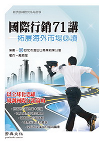 1 對國際行銷的基本認識2 全球化企業如何成為贏家3 全球行銷的重要性4 世界貿易模式5 為什麼要進入國際市場6 國際行銷成功要訣7 國際行銷的競爭策略8 產業競爭的五股作用力9 這是個「過度競爭」的時代10 競爭導向11 舊時代與新時代經濟12 下一代經濟13 行銷環境14 設定國際行銷目標15 跨國公司16 選擇目標市場17 建立全球性地位18 進入國際市場的策略19 進口及出口20 契約上的協定21 國際直接投資22 服務出口23 市場區隔化的標準24 市場區隔化過程25 事業購買情況26 組織機構購買過程模式27 影響事業購買決策的因素28 外包與境外作業29 事業市場需求30 品牌管理31 公司品牌32 私有品牌33 自創品牌34 台灣製-Made in Taiwan35 打造強勢品牌36 國際行銷的特性37 市場區隔38 國際行銷計劃39 事業市場的本質40 B2B市場的特性41 發展國際行銷策略42 無差異行銷43 差異行銷44 集中行銷45 產品策略46 價格策略47 通路策略48 推廣策略49 關係行銷50 國際經濟環境51 國際文化環境52 國際科技、政治、法律環境53 市場佔有率54 不合於貿易品項55 跨國經濟統合56 出口導向的工業化57 東亞國家的經濟奇蹟與發展58 開發中國家的危機與轉機59 匯率的功能60 匯率與價格61 現貨匯率與期貨匯率62 進口關稅63 貿易壁壘64 國際資本市場與資產市場65 逆向行銷66 產品定位67 市場定位68 公司定位69 核心專長70 改善現況71 創造未來