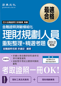 本書主要分為二大部分: (一) 理財工具應用:本考試用書分為十章,包含金融機構介紹、貨幣時間價值、短期保本工具、股票、基金、債券、衍生性商品、投資與經濟指標、保險規劃、信託規劃等,內容經筆者編修後,閱讀上淺顯易懂,並運用簡單之例題解釋較為複雜的觀念,再配合詳盡的試題與解析,定能使讀者輕鬆掌握重點取得高分。 (二) 理財規劃實務:主要編輯採重要之觀念釐清,將理論、實務與考試相結合,主要引導讀者如何在複雜的理財實務中學以致用。讀者可先詳讀書中內容,並實際演練配合各章節內容所列舉的相關試題,並配合歷屆試題與詳解,透過習題的演練來熟悉各章節的基本觀念及重要內容,俾能達成事半功倍之效果。 金融市場的快速發展,相關金融商品創新是必然的,因此,本考試用書亦必須持續更新,才能符合實際環境與潮流,以提供給讀者簡單易懂的閱讀方式,為考取證照之必用參考書籍。 ~ 附99年11月份最新試題及詳盡解析 ~