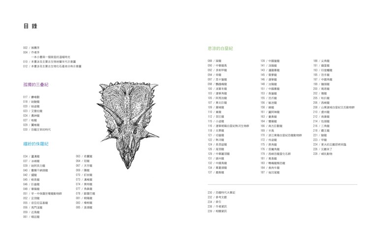 台灣國立自然科學博物館 地質學組研究員兼主任英國倫敦大學古生物學博士張鈞翔博士 推薦序在數億與千萬年前,有一群我們不曾見過的動物,和你我一樣生活立足在這個大地之上。這些當年稱霸四方的統治者,如今煙消雲散,化為了塵土。部分成員似乎不願意就這樣消失落幕,於是轉化成了化石,隱藏在那人煙稀少的高山峻嶺或是盆地裡層層疊疊的沈積岩石之中,想為”牠們”的存在,保留那一絲絲的證據。幾塊在黑龍江河岸被發現的脊椎動物化石,在1930年被俄羅斯科學家發表命名為黑龍江滿州龍(Mandschurosaurus amurensis,Riabinin 1930)。這是在中國境內第一個被正式科學命名的恐龍,揭開了這近百年來中國恐龍粉墨登場的第一個序幕。之後陸續與多個國家合作的考察團,在中國各地進行挖掘工作,盤足龍、鴨嘴龍、似鳥龍、原角龍、蛋化石等,逐漸被發掘出來。中國的科學家也致力於科研考察中,陸續發現了馬門溪龍、青島龍、山東龍、峨嵋龍、四川龍、沱江龍、華陽龍等重要的恐龍標本。90年代開始,在中國內蒙古和遼寧開始發現帶有絲狀痕跡的化石,這些痕跡經過研究認為可能是與羽毛或是毛髮的印痕。這些帶毛恐龍化石的出現,撼動了古生物界,是否恐龍並未滅絕,只是其中的一支經過演化變成了鳥類,長出了羽毛,開始在天空飛翔!這些關鍵的帶毛恐龍標本:中華龍鳥(恐龍、非鳥)、尾羽龍、中國鳥龍、小盜龍、樹息龍、北票龍、麗羽龍、耀龍等等,一一躍上舞台,在中國大陸發掘的化石,提供了多樣物種演化的關鍵證據。“牠們”,不論是天上飛的(翼龍)、地上爬的(恐龍)、水中游的(水生爬行動物),透過化石,留下了訊息,經過古生物學家的解讀與解密,慢慢地揭開神秘的面紗,傳達給”我們”,證明”牠們”確實活過。而傑出的藝術家趙闖和作家楊楊,蒐羅了以上所述的這些研究成果,也包許多近期才發表的新物種,將這些嚴謹的科學期刊與論文發表,藉由精采的繪圖創作和文字寫作,轉換成為一篇篇故事,將這群古生物如大戲般,一幕幕地呈現在我們面前。“牠們”是如此精采好看,相信我們會喜歡!