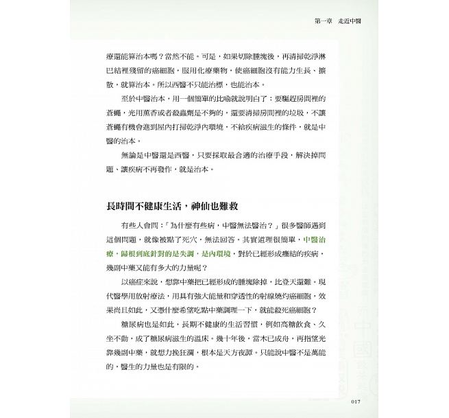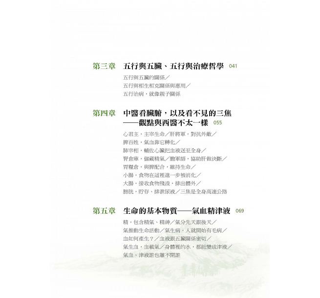 推薦序 學習中醫,必須溯其源、求其本/陳麗蓮自序 中醫藥知識從此對所有的人敞開大門第一部 中醫不神祕,很好懂第一章 走近中醫中醫是騙術還是醫術?/治本?中醫、西醫都能,只是方法不同/長時間不健康生活,神仙也難救/西醫用刪去法找病因/中醫從整體看病/西醫找解決方法,中醫找原因/中醫的「醫」是為了打開身體自癒力第二章 天有黑夜白晝,人有陰陽兩極國外有陰陽概念,但不太會用/早在殷商時代,人們就在使用/人也能靠陰陽分析/陰與陽,彼此制約/陰陽理論,用門來解釋/太多太少,身體都會受不了/疾病、體質也分陰陽,有根據第三章 五行與五臟、五行與治療哲學五行與五臟的關係/五行與相生相克關係與應用/五行治病,就像親子關係第四章 中醫看臟腑,以及看不見的三焦――觀點與西醫不太一樣心君主,主宰生命/肝將軍,對抗外敵/脾百姓,氣血靠它轉化/肺宰相,輔佐心臟把血液送至全身/腎倉庫,儲藏精氣/膽軍師,協助肝做決斷/胃糧倉,與脾配合,維持生命/小腸,食物在這裡進一步被消化/大腸,接收食物殘渣,排出體外/膀胱,貯存、排泄尿液/三焦是全身高速公路第五章 生命的基本物質――氣血精津液精,包含精氣、精神/氣分先天跟後天/氣推動生命活動/氣生病,人就開始有毛病/血如何產生?/血液跟五臟關係密切/氣生血,血載氣/身體裡的水,都能變成津液/氣血、津液誰也離不開誰第六章 氣血的通道――經絡之謎人體到底有多少條經絡?/現代醫學如何認識經絡的?/經絡與腧穴、臟腑的關係/針灸的原理/經絡的作用/經絡的病理變化/讀經絡學說,我們能做什麼?第二部 人為什麼會生病第七章 六淫――自然界的風、寒、暑、濕、燥、火六淫為什麼讓人生病?/風邪──最善變的病/寒邪──傷人陽氣/暑邪──耗氣又傷津/濕邪──濕黏不爽快/燥邪──乾澀容易傷肺/火邪──容易上火、出汗出血第八章 內生五邪――人體的內部矛盾內風──風氣內動/內寒──寒從中生/內濕──濕濡內生/內燥──津傷化燥/內火──火熱內生第九章 飲食失宜――吃不對也會生病食物與疾病的關係/以形補形,以臟補臟/飲食不節/飲食不潔/飲食偏嗜第十章 情緒也能讓人生病――七情致病解碼七情與臟腑的關係/病由心生──看情志如何致病/情緒治病法第十一章 體內的病理產物――痰飲和瘀血有瘀血就有疼痛第十二章 舌象、脈象中的玄機舌上的祕密──看舌診病/把脈真的有那麼玄嗎?第十三章 中醫診斷的綱領――八綱辨證表裡辨證/虛實辨證/寒熱辨證/陰陽辨證第三部 尋找治病的良方第十四章 中藥是怎麼治病的中藥有四氣五味/藥物對哪些經絡臟腑?/根據歸經選用中藥/中醫治病,升降浮沉/是藥都有三分毒/中藥配伍與禁忌/中醫治病分八種第十五章 常用中藥有哪些?人參,補元氣,起死回生/三七,止血化瘀,傷科必備/何首烏,黑髮明目,延年益壽/大黃,攻下通便,藥中將軍/黃連,苦能造濕,寒能清熱/柴胡,溝通表裡,表證剋星/地黃,生熟有別,功效迥異/茯苓,健脾利水,久服不老/金銀花,涼茶首選,清熱解毒/當歸,補血聖藥,活血調經第十六章 生活裡可以作為中藥的東西海帶,祛痰消腫,減肥補碘/山藥,補虛健脾,脾虛救星/大棗,補氣養血,婦人良品/蜂蜜,滋潤補虛,潤腸通便/藕節,涼血止血,滋陰蔬菜/生薑,溫中散寒,養生調料/吃什麼?什麼時候吃?看自然規律第十七章 怎麼看懂方劑――君臣佐使中國歷代醫書/組方原則──君臣佐使第十八章 六大常用方劑四君子湯──補氣之方,致中和/四物湯──補血之方,女性之友/六味地黃丸──三補三瀉,腎虛首選/小柴胡湯──和解少陽,萬能調解/逍遙散──疏肝解鬱,逍遙自在/玉屏風散──弱不禁風,屏風來救第十九章 神奇的艾灸――最簡單的經絡療法艾灸有哪些分類?/哪些病配哪些艾灸療法第二十章 如何培養中醫診療思維中醫思維的傳承困境/如何建立中醫思維